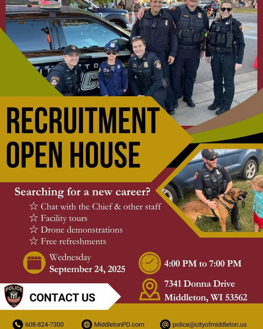| | Event Details | 📅 Wednesday, September 24, 2025 ⏰ 4:00 PM to 7:00 PM 📍 7341 Donna Drive, Middleton, WI 53562 What to expect: - Chat with the Chief and other staff